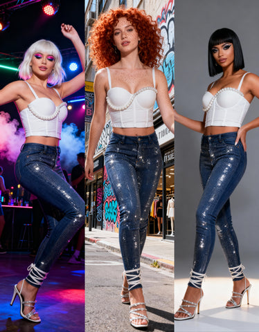 Detalles del Estilo: En la imagen, se complementa con sandalias blancas de tacón y strass, ¡elevando el nivel de glamour al máximo! 👠 Este es el jean ideal para fusionar la comodidad del denim con el impacto visual de una prenda statement que grita ¡Fiesta! 🎉