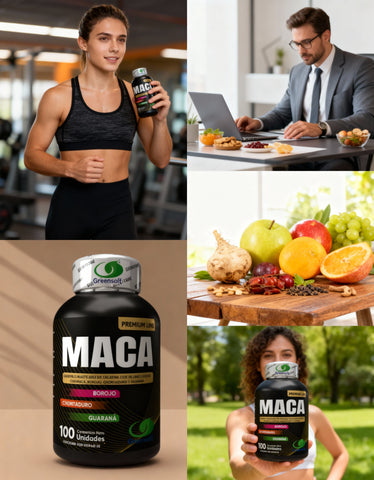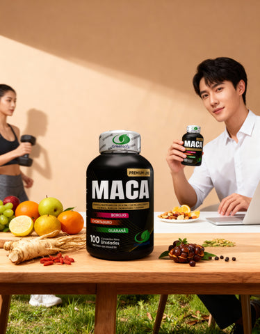 Este producto es un suplemento alimenticio presentado en un envase distintivo de color negro ⚫ con detalles dorados ✨ y verdes 🍃, diseñado para comunicar calidad y un estilo de vida saludable 💪. La etiqueta principal, "MACA", destaca prominentemente en letras grandes y claras, indicando su ingrediente principal 🌱 y el posicionamiento "Premium Line" 🏆.