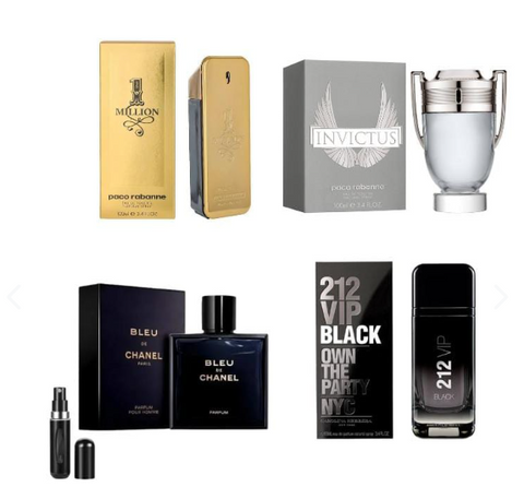 4 PERFUMES ON EMILLION, 212 VIP BLACK, BLEU CHANEL, INVICTUS MAS UN PERFUMERO RECARGABLE